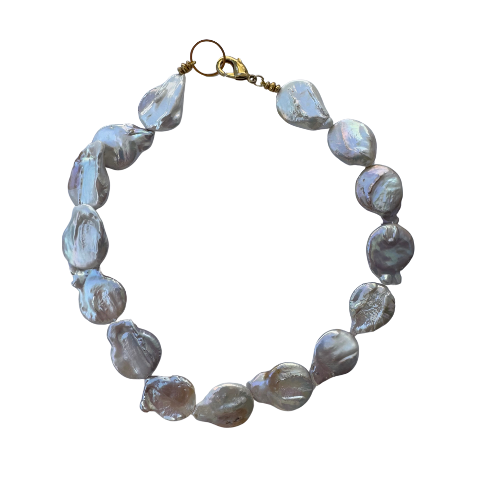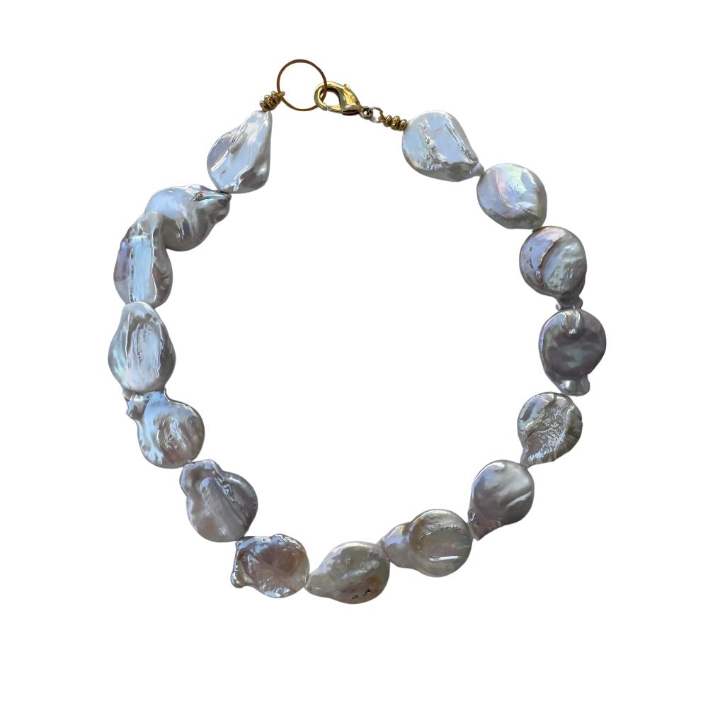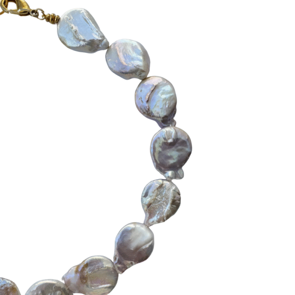 White, grayish fresh water Keshi pearl with touch of golden color and stainless steel clasp